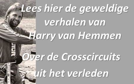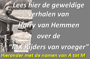 Jammer dat al die grote wedstrijden (Bergharen, Norg, Sint Anthonis etc etc) nu allemaal historie zijn. Afijn de jeugd weet niet beter dan Monster of Cairoli of Herlings maar gelukkig hebben wij de mooiste cross jaren nog meegemaakt op echte cross banen. Nou ja elke generatie heeft zijn helden. Nu met meer vrije tijd is het leuk deze en andere sites te bezoeken en af en toe oude herinneringen op te halen. Het was inderdaad niet alleen de wedstrijd maar de hele sfeer erom heen. Ik ben na de avondcross in Heerlen nog eens ingehaald door Henk WP Thuis op de A2, ik had hem nooit van achter zien aankomen ... hij reed namelijk zonder licht. Kwajongens - jazeker. Zo maar een van vele herinneringen, ja zou een boek kunnen schrijven maar doe het toch maar niet haahaa Met het zien van al die prachtige oude foto's komen de herinneringen boven. Er werd door Jan Müller geopperd een boek te maken, ik deel liever mijn stukkies met jullie op deze site ah ah. Klik op de naam van een rijder, om Harry zijn stukjes te lezen. Klik hier voor de rijders N tot Z
