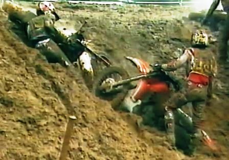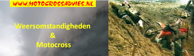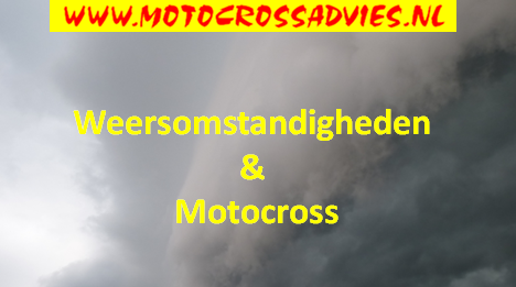 Regen, water en kou gaan vaak samen, let er op dat je als rijder warm en droog blijft voordat je aan de race begint. Een terdege voorbereiding is hier van groot belang,een slechte preparatie betekend al op voorhand een slechte uitslag. Zorg voor voldoende wedstrijdkleding, een grote paraplu zorgt voor meer bescherming als een kleine en zorg voor grote plastic zakken om al je natte spullen in op te bergen. Zorg voor extra vizieren op je bril, plak een strook tape over je helmklep zodat er geen water tussendoor kan sijpelen. Ook als er veel modder op je helm zou blijven zitten kun je hier als voorzorg een stuk brede tape plakken vanaf je klep tot midden op je helm, laat wel een strook dubbel geplakt zitten bij je klep zodat je onder het rijden deze strook kunt wegtrekken en de modder van je helm weg is. Je laarzen kun je ook met zware tape afdichten zodat er geen water en modder in kunnen lopen. Je grootste probleem zal je MX bril blijven bij nat en modderig weer. Zorg er voor dat je thuis reeds een aantal brillen hebt voorbewerkt, dit spaart ellende tijdens een wedstrijd, denk er aan je hebt vaak twee trainingen en ook nog twee of drie manches zodat drie tot vijf brillen geen luxe zijn. Het dragen van een regen of windjack helpt vaak om je shirt droger te houden en de modder er makkelijker vanaf gaat tijdens het rijden. Nu een aantal modder rij tips; laat je achterwiel zo weinig mogelijk spinnen, een ronddraaiend achterwiel heeft geen grip en je komt dus ook niet vooruit. Bedenk dat als je maar langzaam rijdt je achterwiel modder zal afwerpen en je meer grip hebt dan als het wiel met vele omwentelingen spint. Zoek ook altijd een stukje circuit waar het iets harder is om al rijdende je achterband vrij te maken van de modder. Probeer zo relaxt mogelijk te rijden in de modder, sta op je voetsteunen en probeer met je lichaam te balanceren, op deze manier kun je ook het beste je remmen en schakelpook bedienen. En ben je verzekerd dat je of voldoende druk kunt zetten op je achterwiel om te kunnen acceleren en ook voldoende druk kunt brengen op je voorwiel om te kunnen sturen. Sporen rijden kan het beste door staande op je steunen met de machine losjes in je handen er als het ware overheen dansend. (Als je ooit de kans krijgt om Stefan Everts nog eens te zien rijden let dan eens op zijn rijstijl) Kijk ook steeds hoe de lijnen per ronde wijzigen in deze modder en ben er op voorbereid om in de volgende ronde een andere lijn te kunnen benutten, ook gevallen rijders kunnen voor problemen zorgen, ben er op voorbereid.